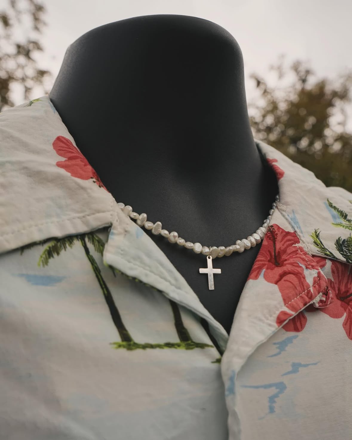 Made using fresh water keshi pearls with a 14k gold-filled necklace. Made with a Sterling Silver cross. 18 inch necklace.