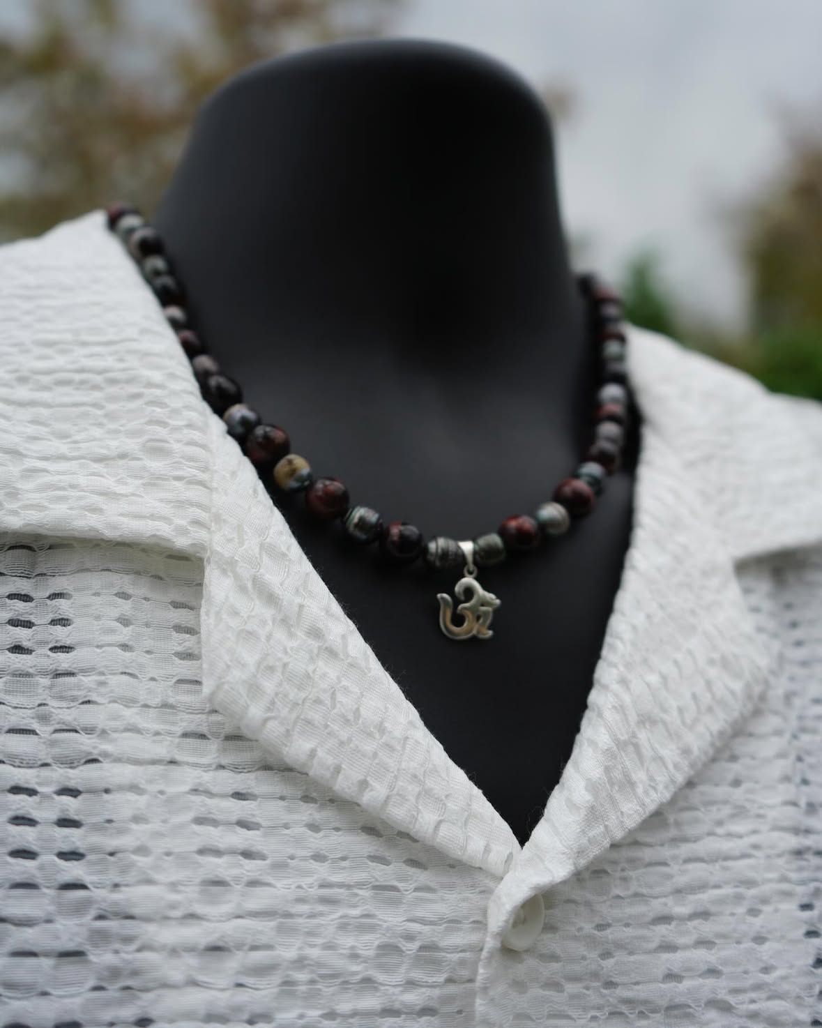 Tahitian pearl, Tiger eye stone with silver Om pendant. 18in